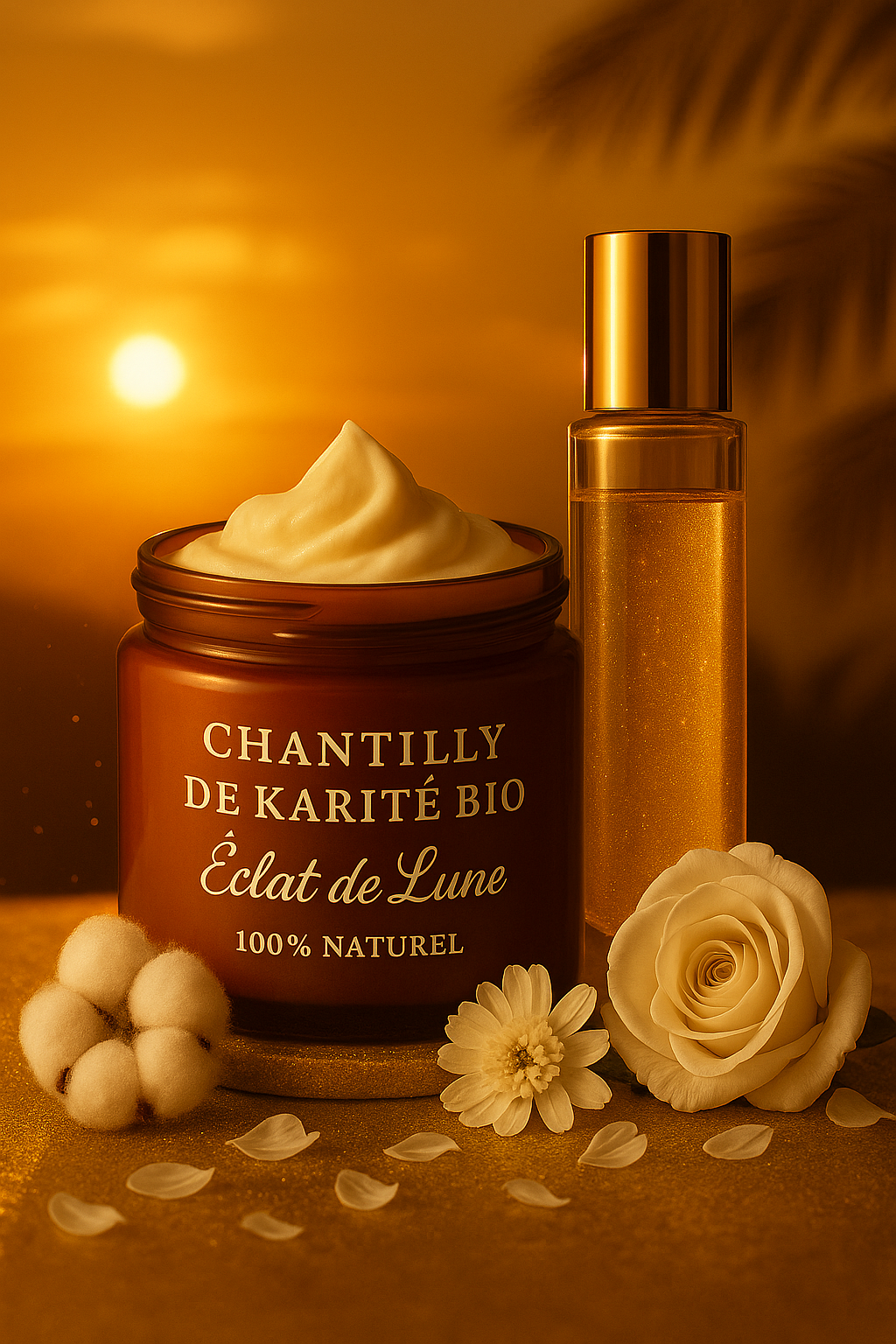 Le Pack Musc Premium – Glow & Douceur réunit l’essentiel pour une peau sublimée, douce et lumineuse. La chantilly de karité éclat de lune nourrit intensément la peau, la laissant souple et délicatement parfumée, tandis que l’huile pailletée apporte un éclat doré subtil pour un effet glow élégant. Un duo sensoriel et raffiné pour illuminer la peau et sublimer chaque instant.