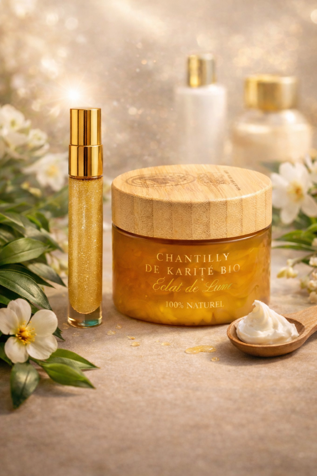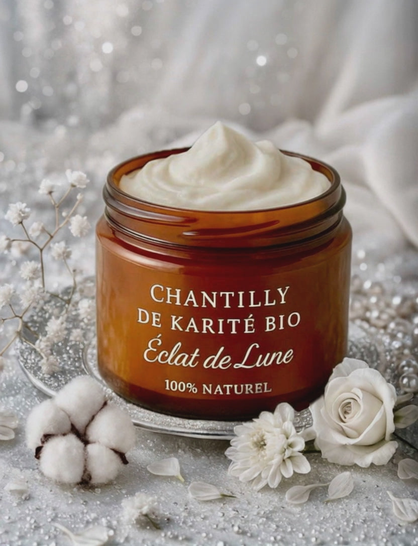 Contenu :1 Chantilly de karité éclat de lune + 1 Huile pailletée parfumée